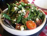 Spinach in a raspberry vinaigrette with walnuts, dried cranberries, apple slices, topped with a warm goat cheese crouton
